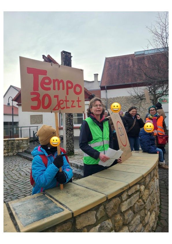 Plakat: Stefan MatlikRund 90 Bürgerinnen und Bürger demonstrierten am 17. Januar bei sonnigem Winterwetter für die Einführung von Tempo 30 auf der engen Durchgangsstraße in Essenheim.